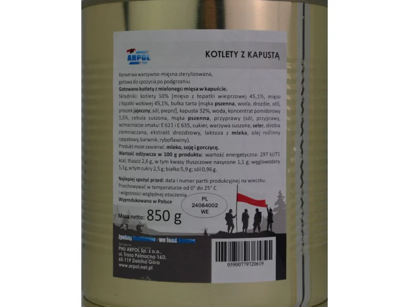 Składniki: kotlety 50% [mięso z łopatki wieprzowej 45,1%, mięso z łopatki wołowej 45,1%, bułka tarta (mąka pszenna, woda, drożdże, sól), proszek jajeczny, sól, pieprz], kapusta 32%, woda, koncentrat pomidorowy 3,5%, cebula suszona, mąka pszenna, przyprawy (sól, przyprawy, wzmacniacze smaku: E 621 i E 635, cukier, warzywa suszone, seler, skrobia ziemniaczana, ekstrakt drożdżowy, laktoza z mleka, olej roślinny rzepakowy, barwnik: ryboflawiny].