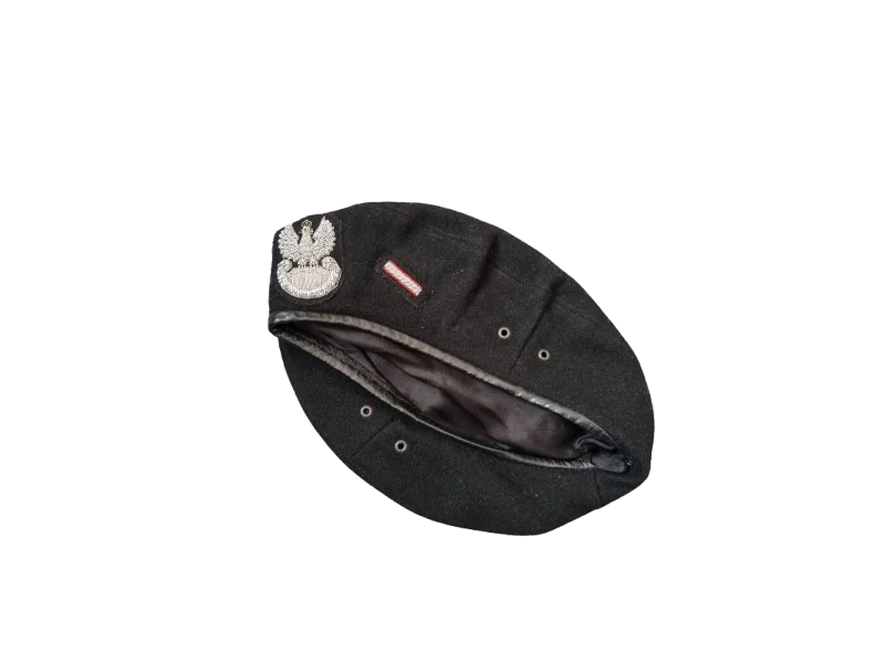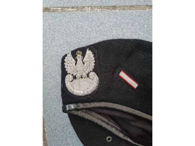 Beret wojskowy czarny z bajorkiem Wzór wojskowy: 418/MON UŻYWANY - stan bardzo dobry, obszyty stopniem starszego specjalisty, ślad po proporczyku