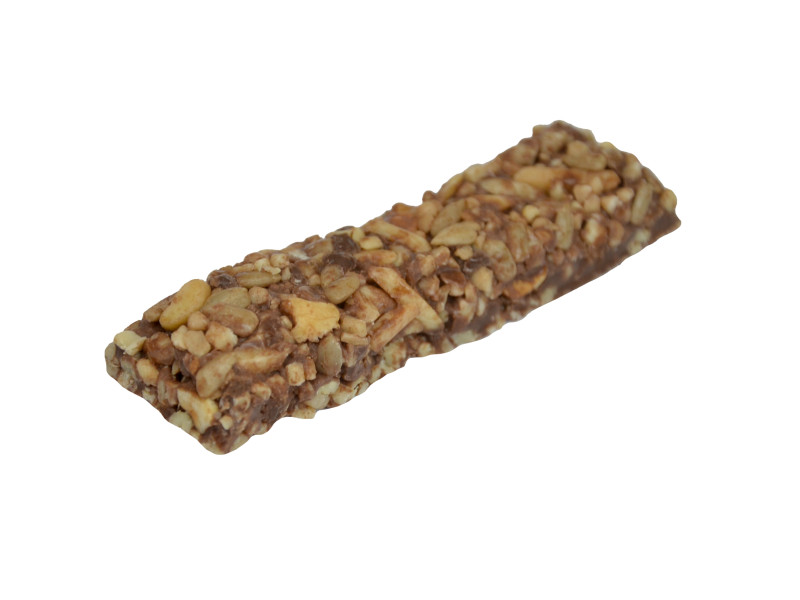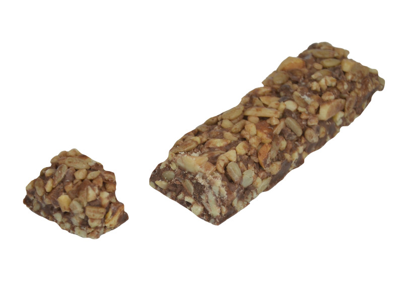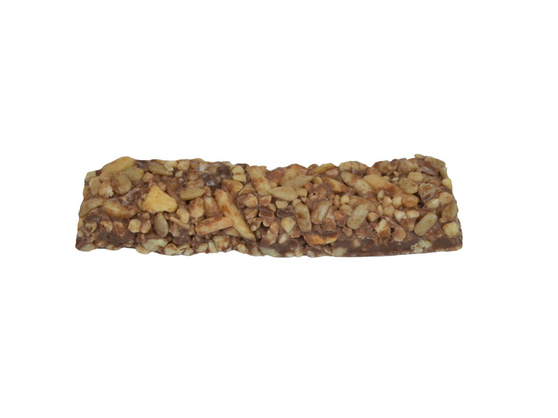 Składniki: mix orzechowy 41% (orzeszki ziemne, orzechy laskowe, migdały), cukier trzcinowy, syrop glukozowy, dekstroza, tłuszcz rzepakowy, tłuszcz kokosowy, słonecznik, czekolada (miazga kakaowa, masło kakaowe, aromat waniliowy), kakao, odtłuszczone mleko w proszku, emulgator: lecytyny (z soi).