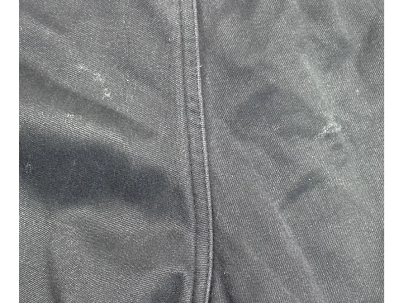Używany - stan dobry, wyblaknięty kolor, delikatne przetarcie materiału na pośladkach (widoczne na ostatnim zdjęciu), guzik obszyty zieloną nitką.