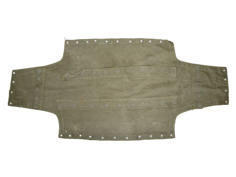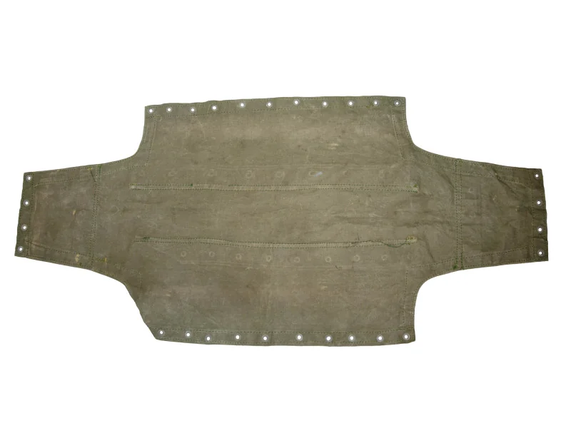 Oryginalne poszycie do łóżka polowego (kanadyjki) używanego w Wojsku Polskim. Poszycie wykonane z grubego płótna parcianego, z metalowymi oczkami do montażu na stelażu łóżka.