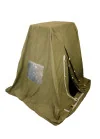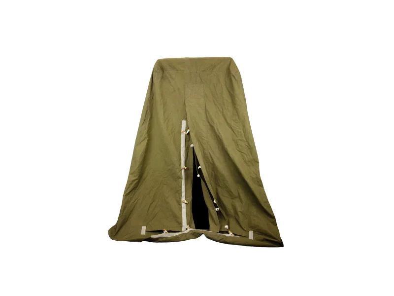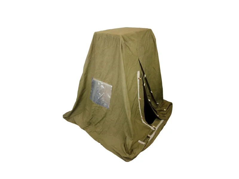 Oryginalny wojskowy namiot sanitarny przeznaczony do ustawienia na stelażu jako osłona toalety polowej, prysznica lub umywalki. Wykonany z grubego materiału w kolorze oliwkowym, posiada wejście zapinane oraz 2 okienka z folii.