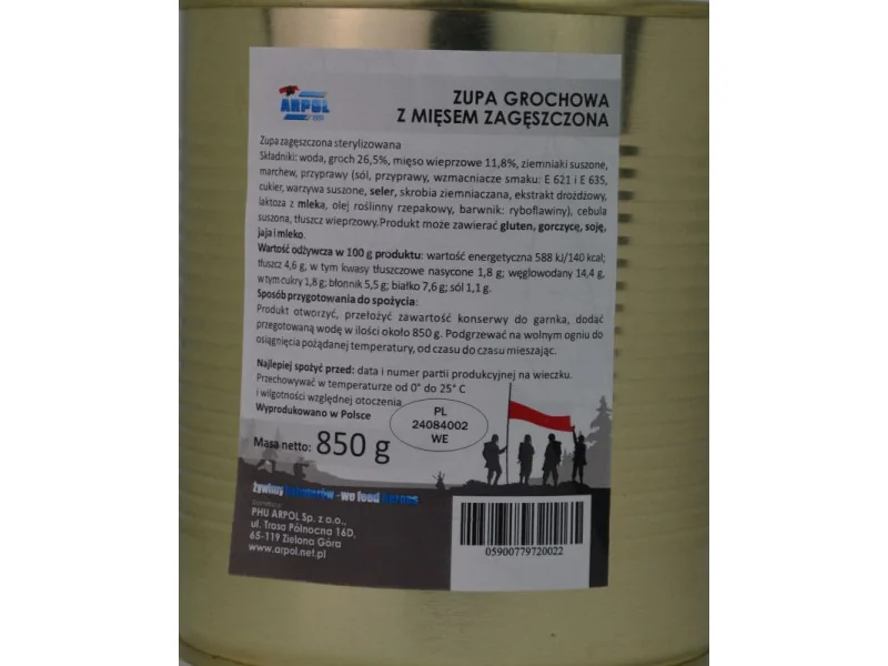 Składniki: woda, groch 26,5%, mięso wieprzowe 11,8%, ziemniaki suszone, marchew, przyprawy (sól, przyprawy, wzmacniacze smaku: E 621 i E 635, cukier, warzywa suszone, seler, skrobia ziemniaczana, ekstrakt drożdżowy, laktoza z mleka, olej roślinny rzepakowy, barwnik: ryboflawiny), cebula suszona, tłuszcz wieprzowy.