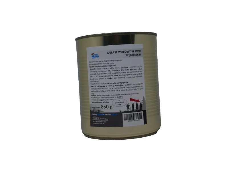 Zabierz ze sobą oryginalną, wojskowy gulasz. Ten aromatyczny wieprzowy gulasz sprawdzi się w każdych warunkach. Można go jeść zarówno na zimno, jak i po podgrzaniu.