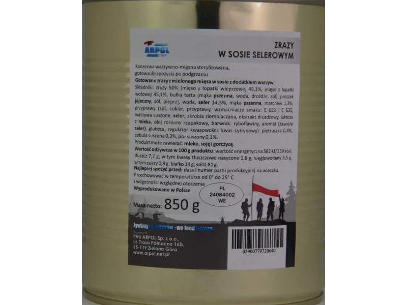 Składniki: zrazy 50% [mięso z łopatki wieprzowej 45,1%, mięso z łopatki wołowej 45,1%, bułka tarta (mąka pszenna, woda, drożdże, sól), proszek jajeczny, sól, pieprz], woda, seler 14,3%, mąka pszenna, marchew 1,3%, przyprawy (sól, cukier, przyprawy, wzmacniacze smaku: E 621 i E 635, warzywa suszone, seler, skrobia ziemniaczana, ekstrakt drożdżowy, laktoza z mleka, olej roślinny rzepakowy, barwnik: ryboflawiny, aromat (zawiera seler), glukoza, regulator kwasowości: kwas cytrynowy), pietruszka 0,4%, cebula suszona 0,3%, por suszony 0,1%.