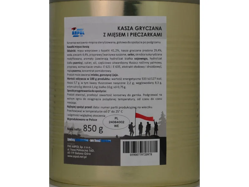 Kasza gryczana z mięsem i pieczarkami. Konserwa wojskowa.